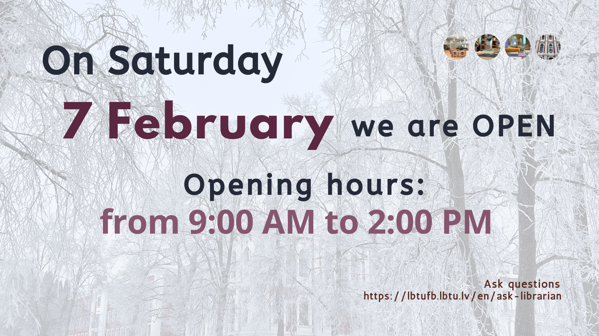 On Saturday, February 7, the library is open from 9am until 2pm