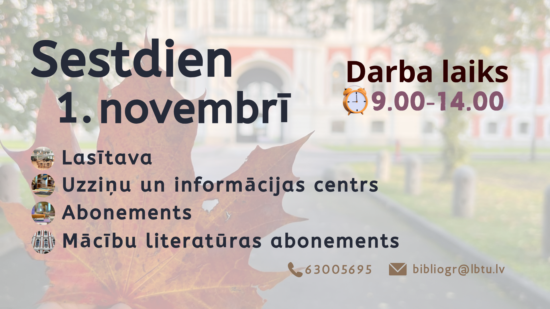 Sestdien, 1. novembrī, LBTU Fundamentālā bibliotēka lasītājiem atvērta no plkst. 9.00 līdz 14.00